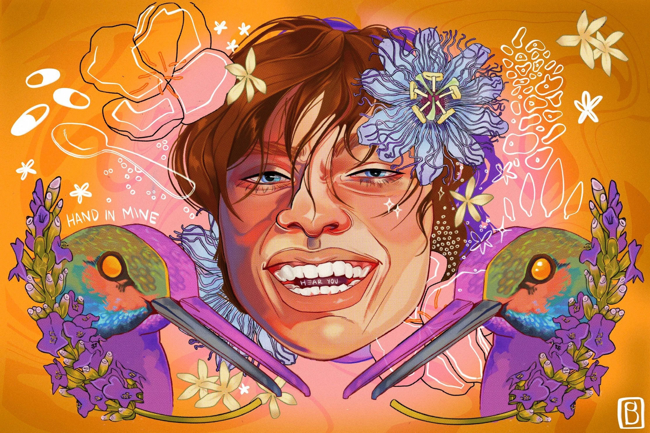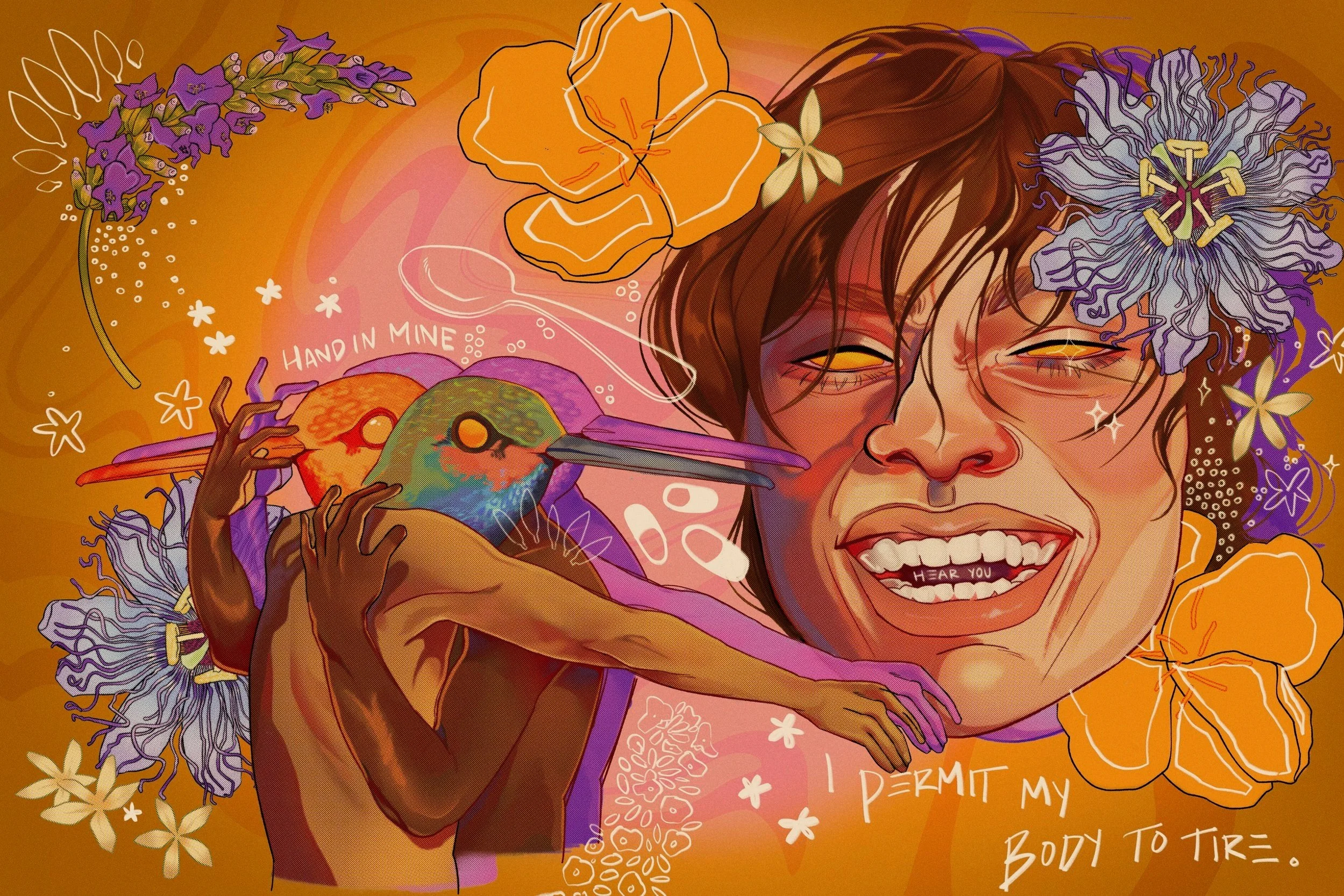 “As someone diagnosed with a myriad of conditions, especially quite young, the greatest struggle I battled in my personal growth was the overwhelming isolation that comes with pain and illness. Each part of this piece uses different forms of visual symbolism to represent different aspects of the emotional and spiritual “bloom” that comes alongside finding and healing with others alongside you. Each of the flowers illustrated is known for its medicinal properties, intentionally chosen for their use in easing the most common symptoms across autoimmune diseases, such as inflammation, fatigue, or nausea. Hummingbirds are a symbol of hope, change, and the binding of the heart. I wanted this piece to be bursting with the vividity that we so often feel we loose when we fight alone, and that comes back so much brighter when we find those to stand beside us.”